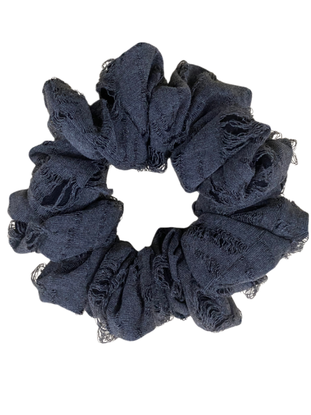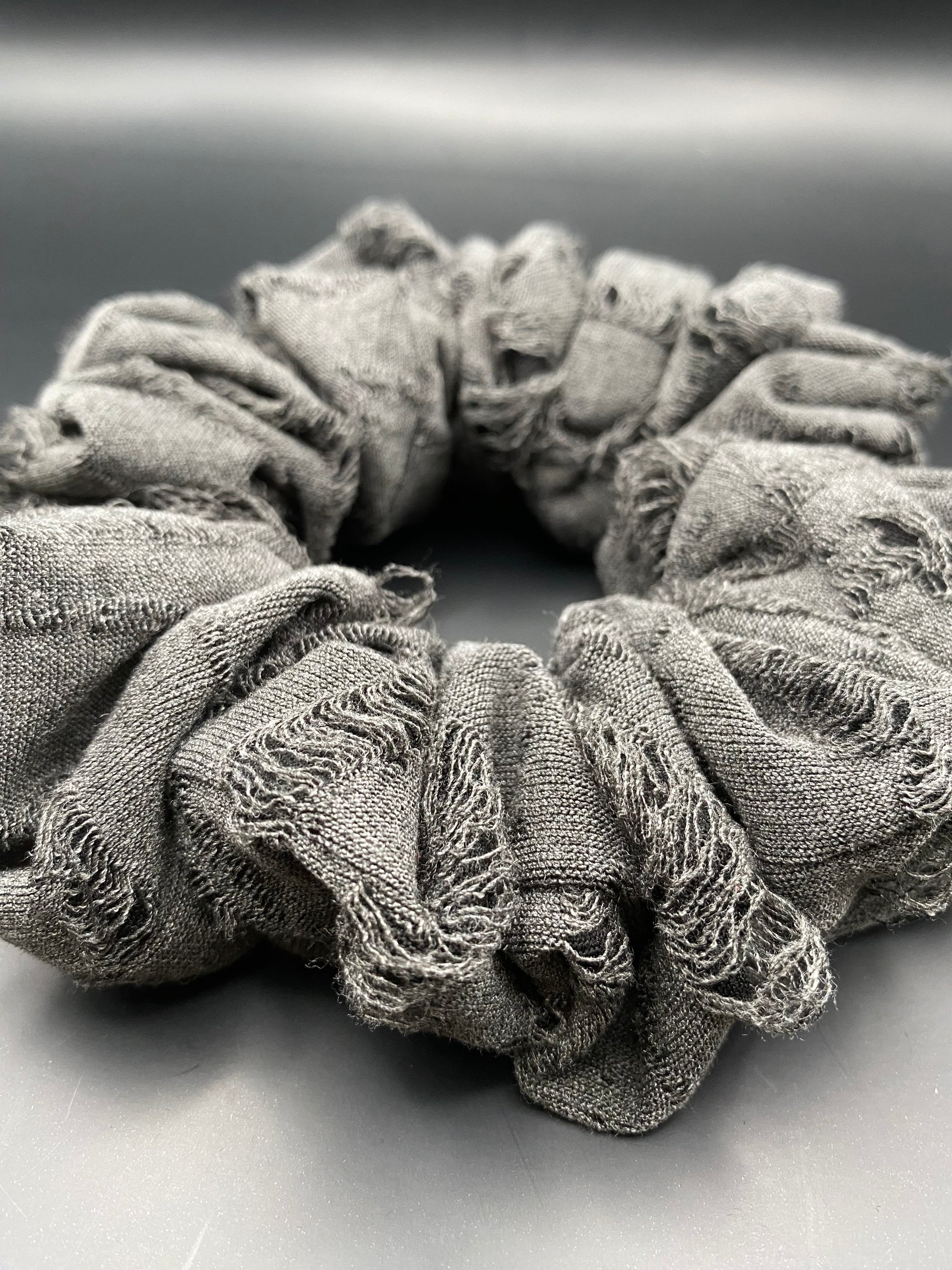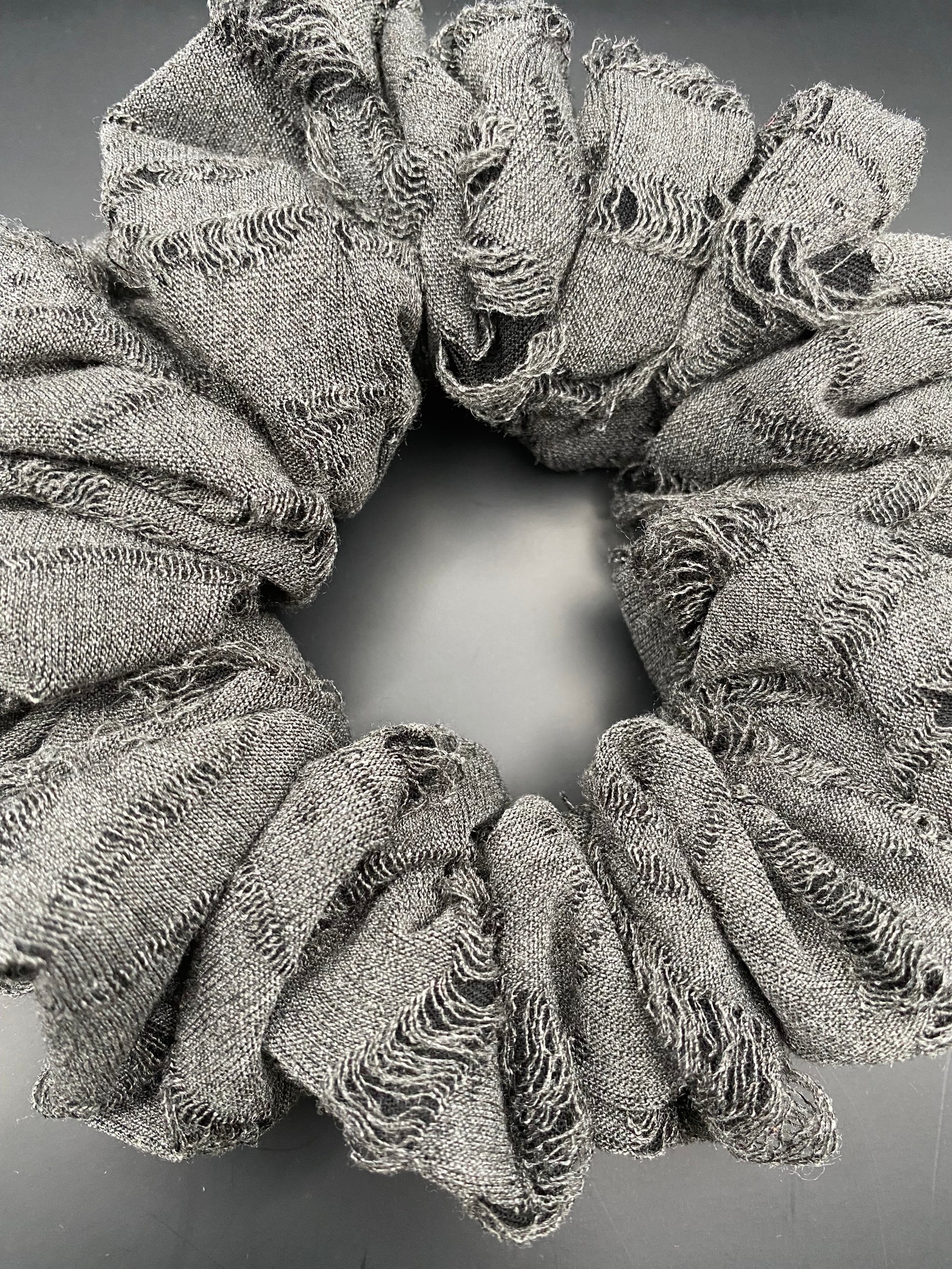 A grey and black textured and teased Scrunchie inspired by zombies, monsters and scary, ripped costumes. What will you wear this Halloween?