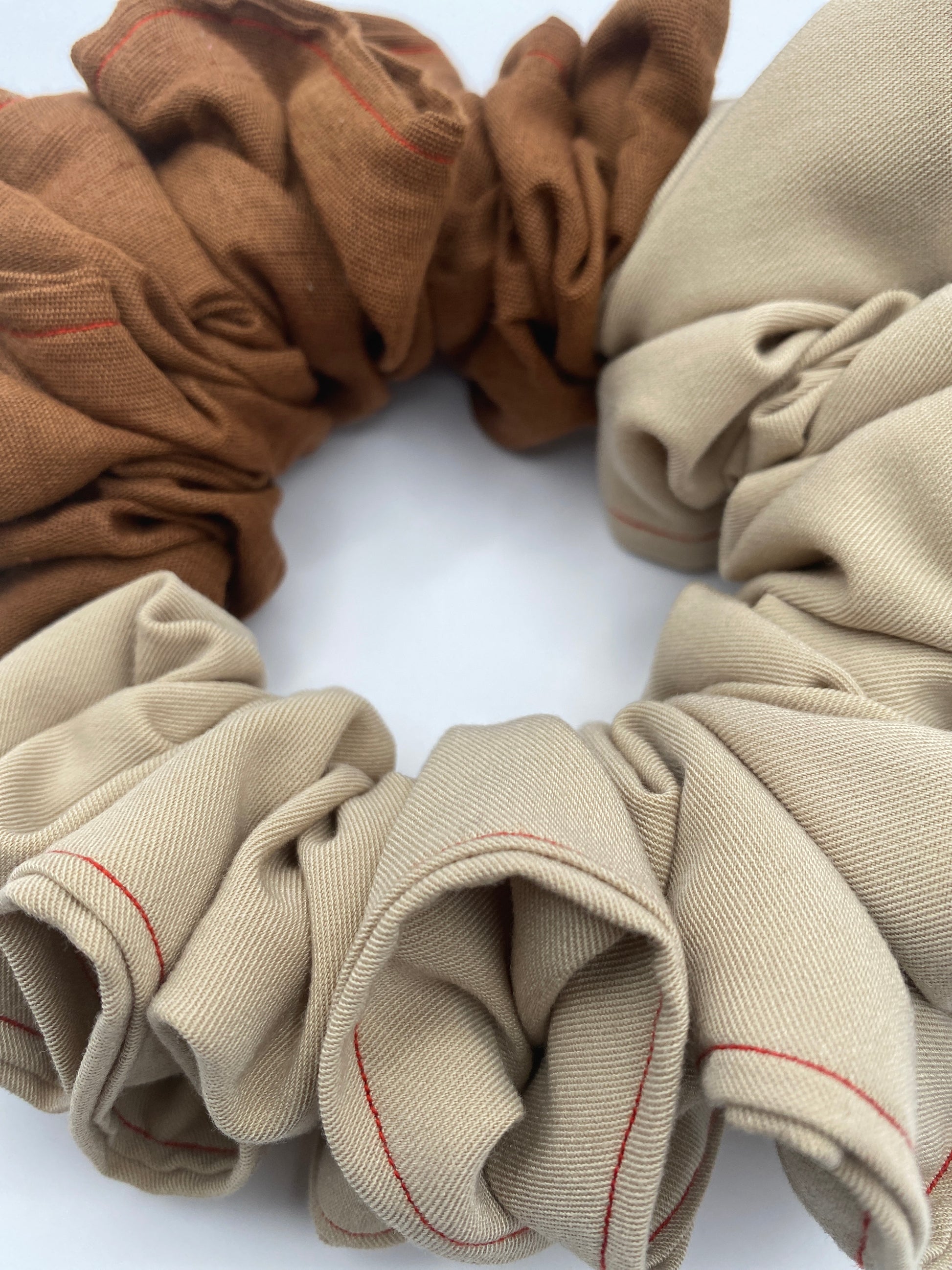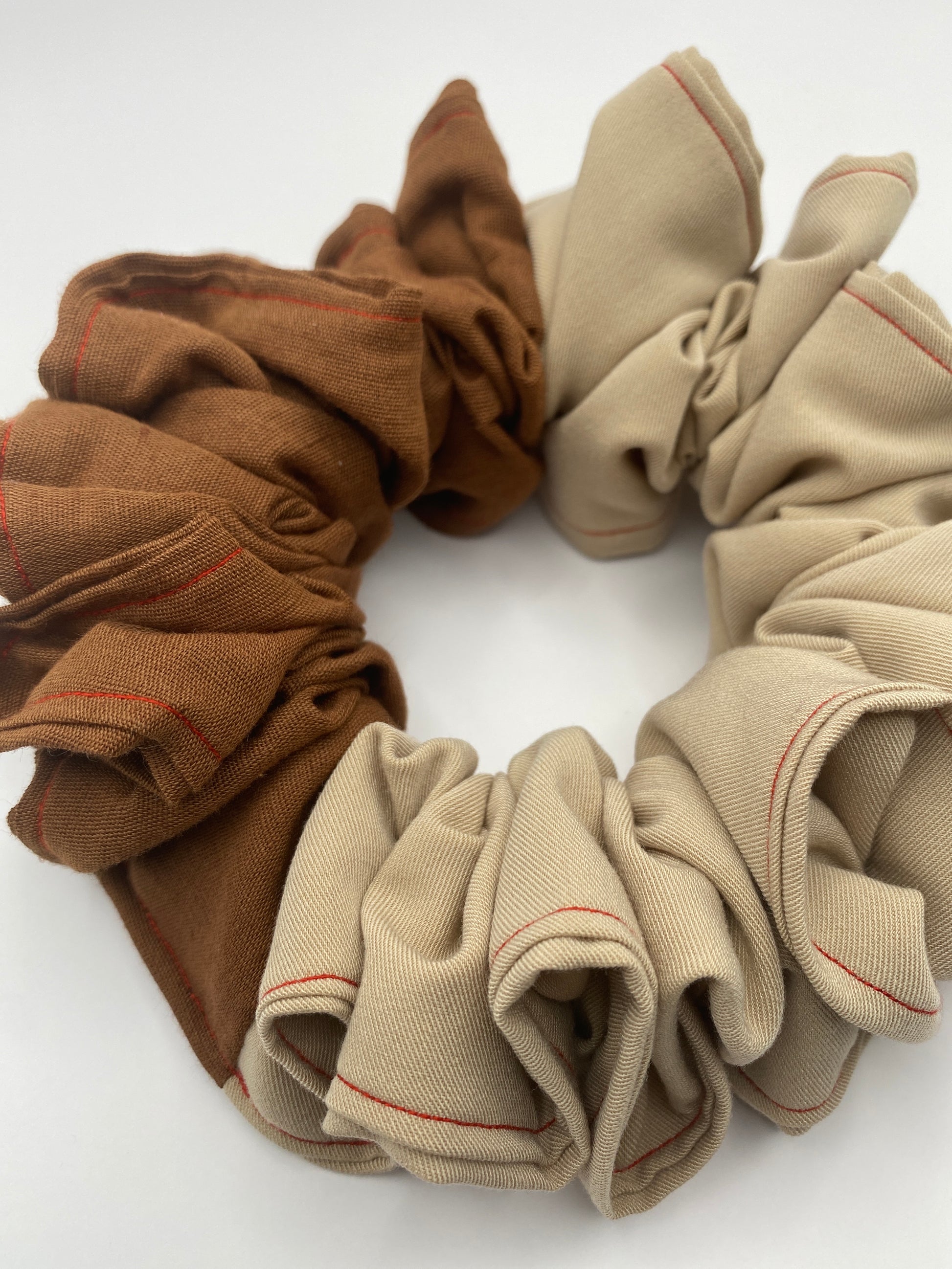 Invite the darkness in this Friday with GET OUT! directly inspired by the haunting suspense of an imaginary friend. This sophisticated scrunchie features a neutral brown and beige color palette accented with a red lining stitch representing the visuals of a shadows tailored suit.