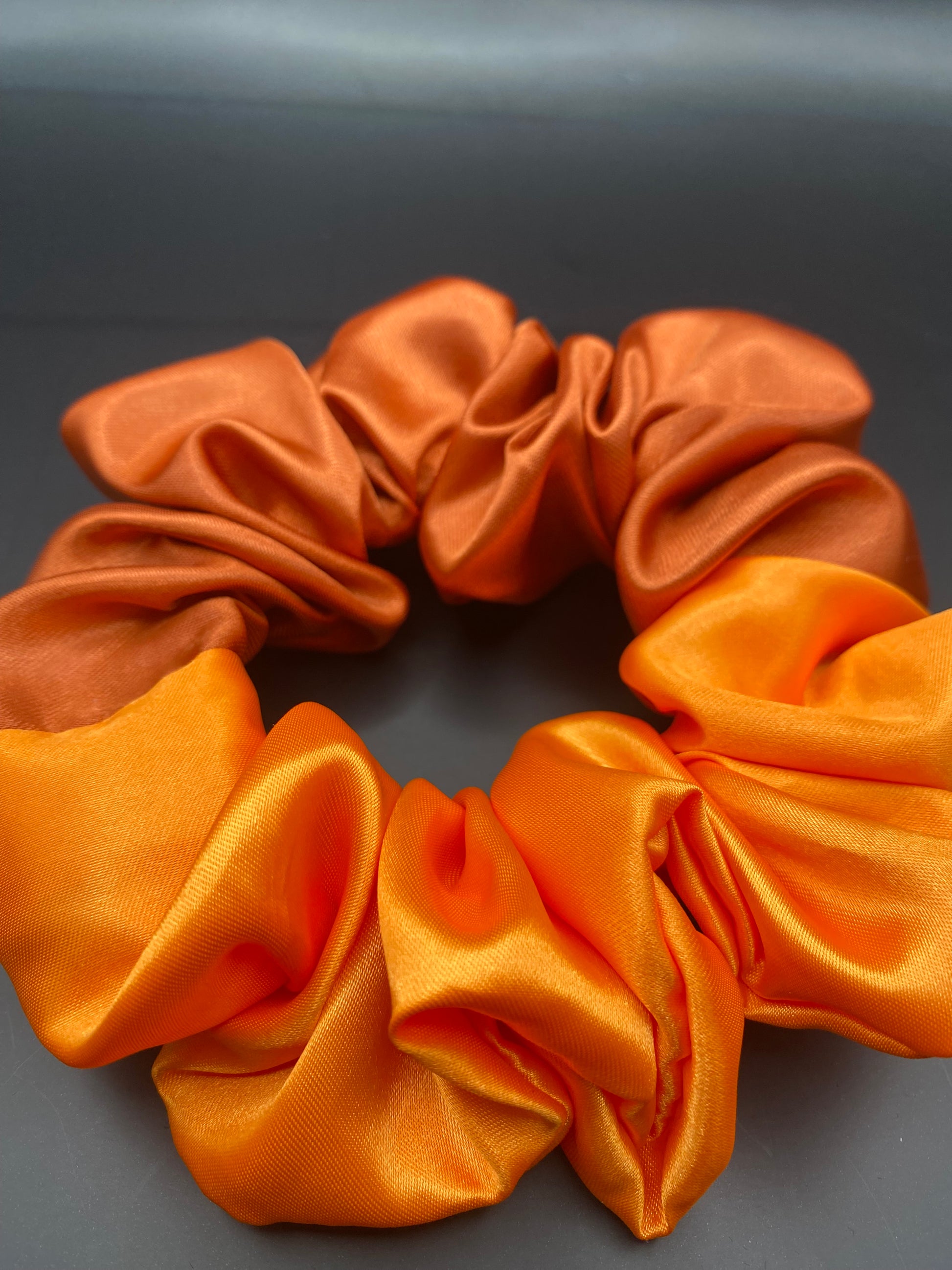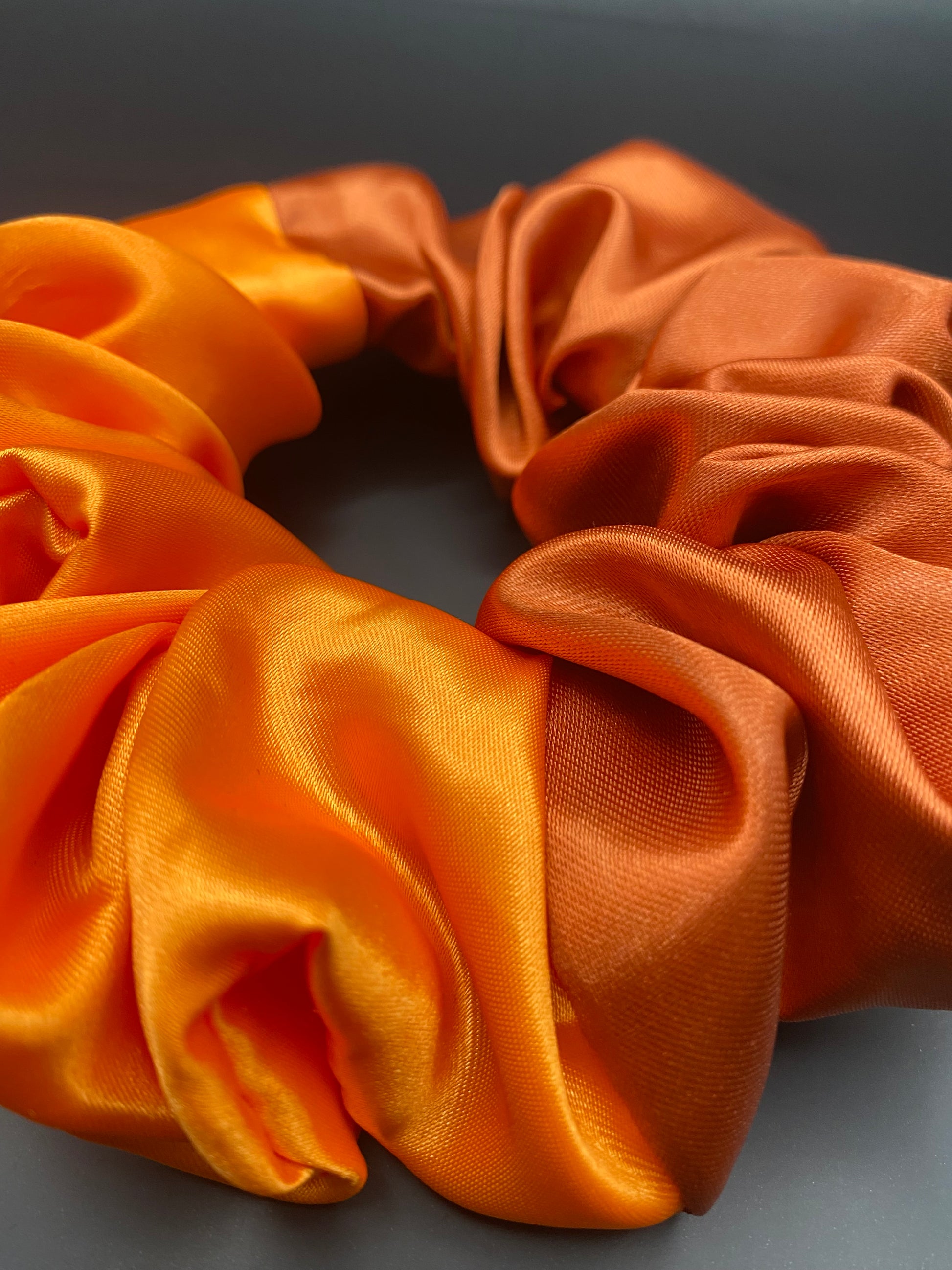 An orange and brown hybrid satin scrunchie, inspired by the best drink in town - Can I get a venti pumpkin spiced frappe please?!