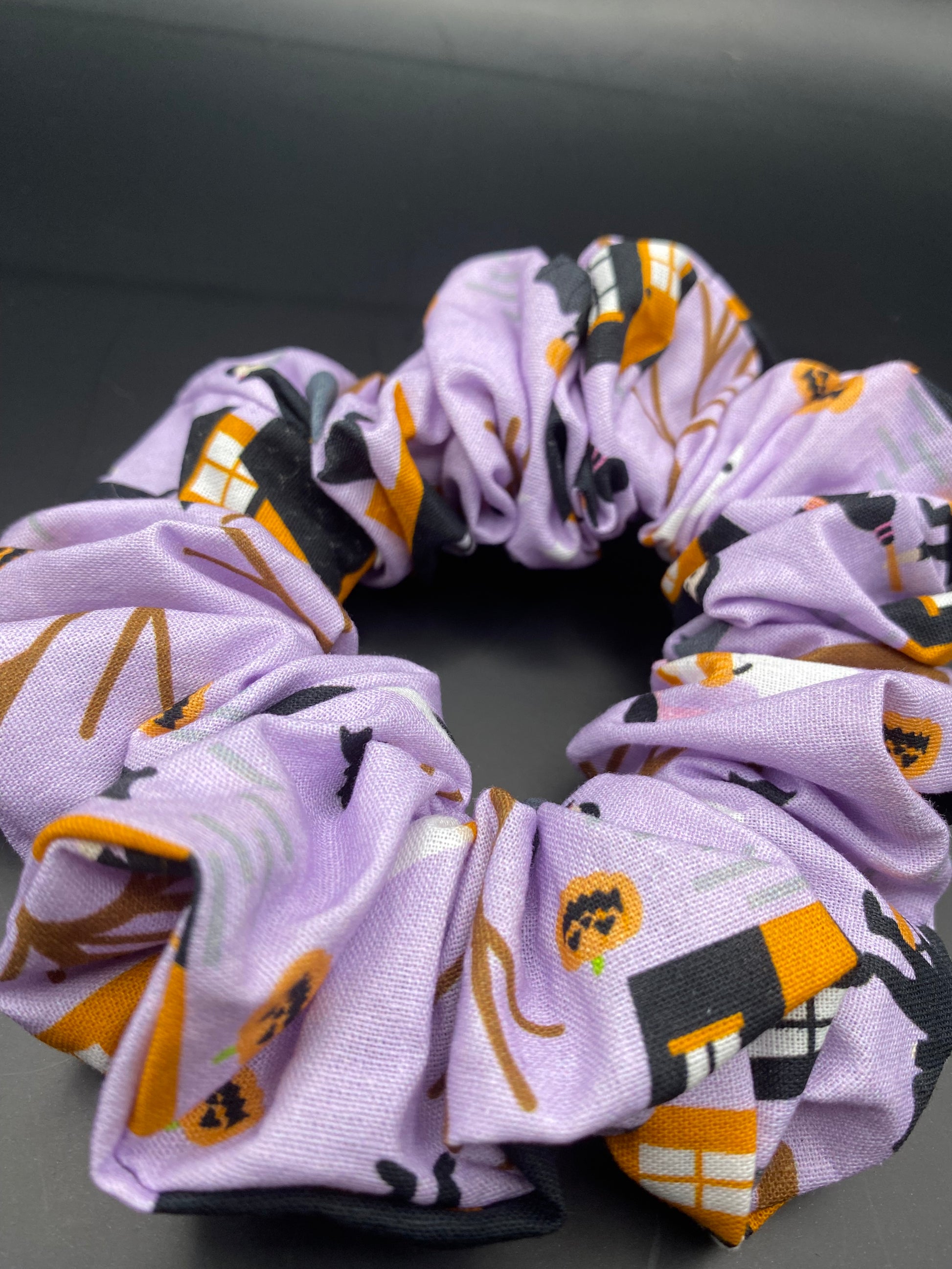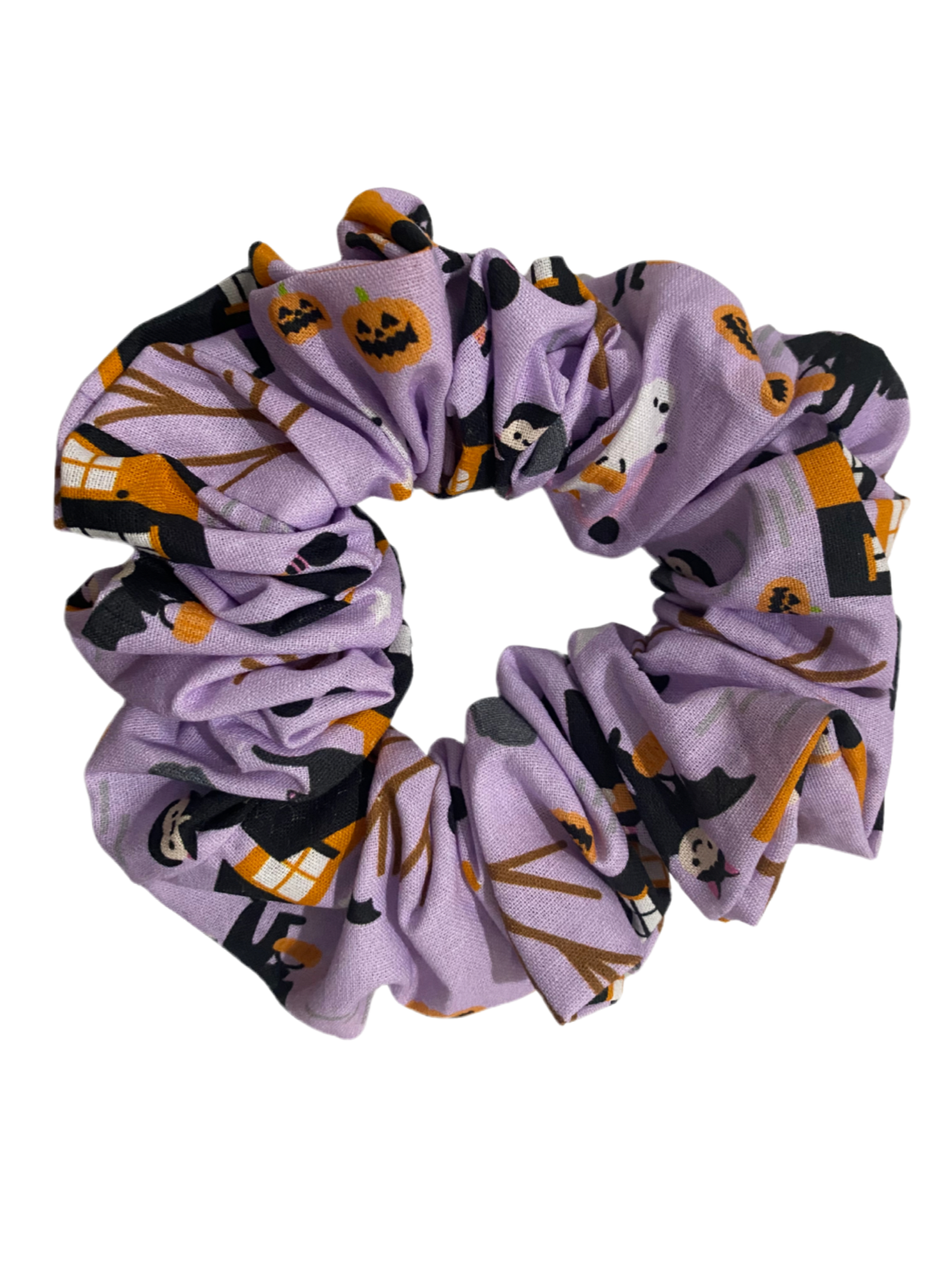 Purple Halloween inspired cotton scrunchie with a scene of trick or treaters on the hunt for the sweetest lollies out!